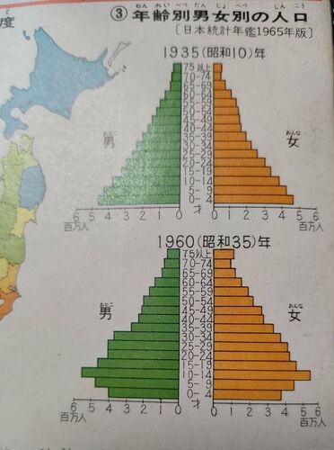 テレビの情報番組でよく見る年齢別人口分布。 まだ1960年代は戦後20年程度だったからまだピラミッドの形をしているがよくよく見れば団塊の世代が膨らんだまま上昇を始めている。この地図帳が発行された1970年頃、団塊の世代のジュニアが生まれて子供の数が増…