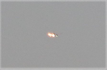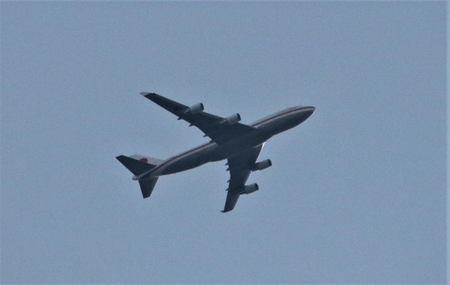 望遠レンズで除くと飛行機の形、夕日を反射させて光っていた。