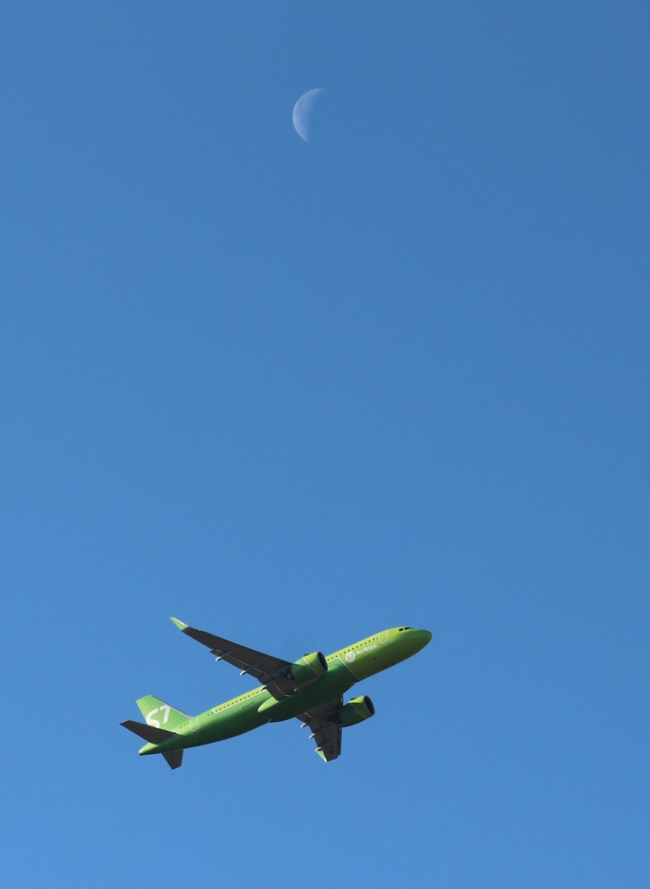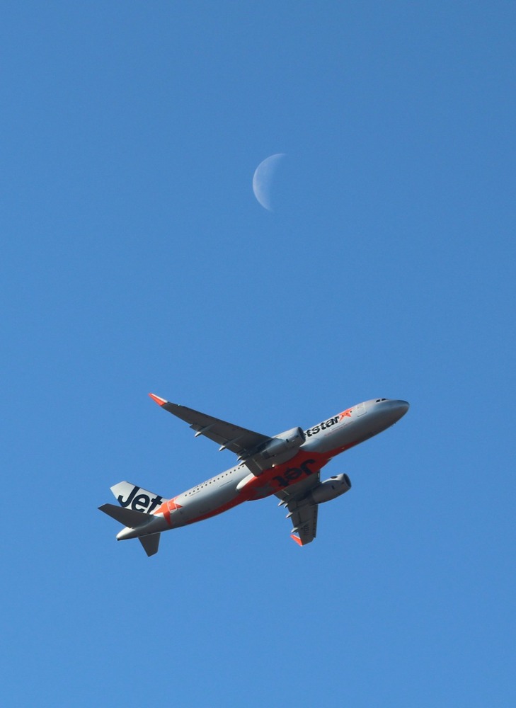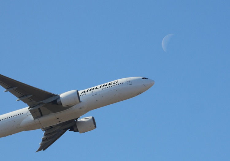 2020-01-21 ■ 飛行機 昨日のみぞれはやんで晴天の朝になった。 外は0度近い。6時に起きて暖かい部屋で撮影開始。 窓から見えないB滑走路の到着は始まったが、A滑走路の離陸は7時になってから。 写真は1番機(?) 月は下限を過ぎて三日月状態、時間とともに西に傾いてきて離陸機に近づく。 そして最初にかぶる瞬間がやってきた。 とは言っても飛行機がでかすぎる。(笑) かぶるというよりは隠したという感じ。 よくよく見ると、飛行機が近すぎるためぶれている。 シャッタースピードを上げて次の瞬間を待つ。