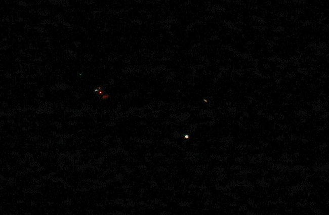 2020-12-24 土星木星の最接近 写真 よくぞここまで接近した、というほどくっついていたね。 望遠レンズでもこれだけ寄っている。 他の人が撮影していたので私も挑戦。 木星のガリレオ衛星。 本来は三脚固定できちっと撮りたいところだが、手すりにレンズを当てて。 やっぱりブレた。 下手な鉄砲も、と何枚か連射してみたがブレブレだった。 「下手くそだなあ」とがっかりしながら空を見ていると動く光が。 飛行機とのコラボはいかがだろうか。 こちらは土星の輪まできれいに撮れた。 最後に上弦直前の月。