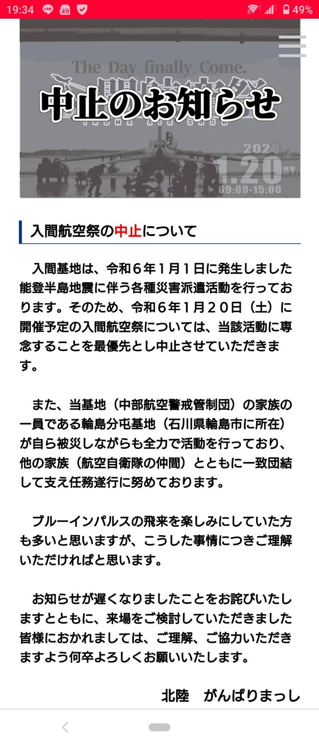 2024-01-10 震災と入間 飛行機 ニュース ついに震災の影響が私のところまで届いてしまった。 長年文化の日だった入間航空祭、1月に変更になったのが震災で中止となった。理由はしかたがないことなんだけど、マニアにはため息。 そんなことなら12月の百里に行けばよかったか。