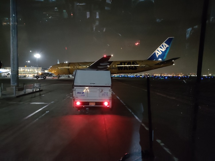 スターウォーズジェット、黄色いC3がプッシュバック、わたしたちの前を通せんぼ。