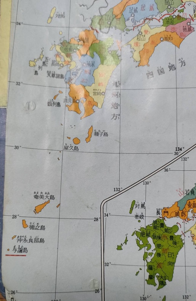 ちょいと引っ張るとページが外れそうな地図帳を開く。この地図帳の発行は1970年とある。つまり1960年代のデータが入っている。表題にあるように、沖縄返還は1972年だからこのときはまだアメリカの領土である。ちゃんと鹿児島県与論島で国境線がある。