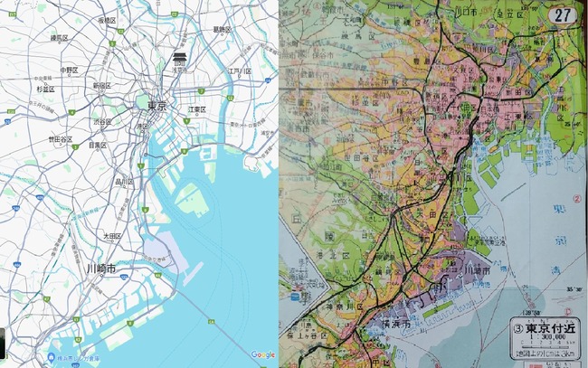 気になるのが湾岸地域、特に台場から浦安にかけてはずいぶん違う。メトロ東西線(当時は営団)が西船まで開通したのが1969年、この地図の編集段階では東西線はない。浦安は交通のない小さな漁師村だったのだろう。浦安市役所通りはカーブが多い。昔の海岸線だったのでは。その東側浦安ICの近くに海楽という地名がある。海を楽しむ。昔は海楽海水浴場だったと聞いたことがある。多分1960年代の海岸線と一致しているか。