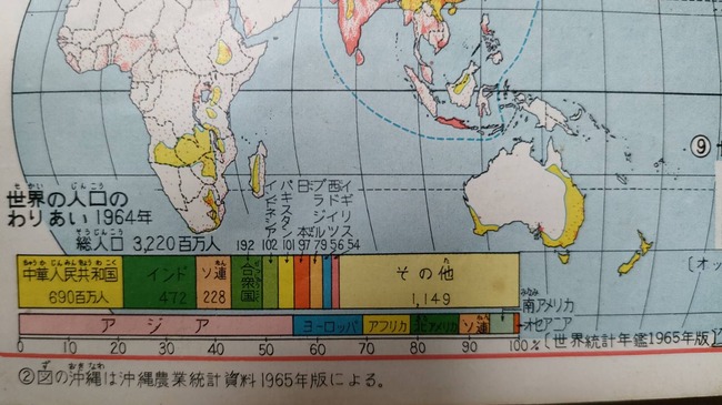 総人口3,220百万人 と書いてある。小学生がこれをすんなり読めたのだろうか。漢字にルビこそふってはあるが、ちゃんと大人が見ても使えるような地図帳になっていた。今の小学校のように教科書に変なキャラクターがヒントを出したり、人気キャラクターが表紙のドリルなど当時は無かった。