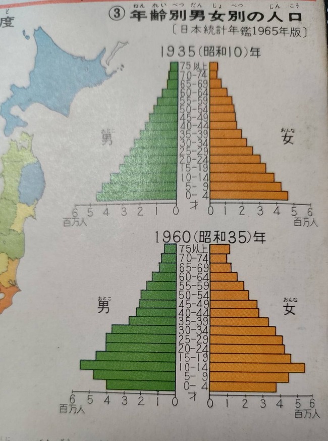 まだ1960年代は戦後20年程度だったからまだピラミッドの形をしているがよくよく見れば団塊の世代が膨らんだまま上昇を始めている。この地図帳が発行された1970年頃、団塊の世代のジュニアが生まれて子供の数が増えることになるが、団塊の世代の山を超えることはなく、さらにジュニアのジュニア世代はほぼ山がないまま推移していく。そしてこの図では75歳以上という括りになっている。現在団塊の世代はその75歳に差し掛かっていてこの図はキノコ状になっていくわけだ。60年前の編集者に予見できたかね。