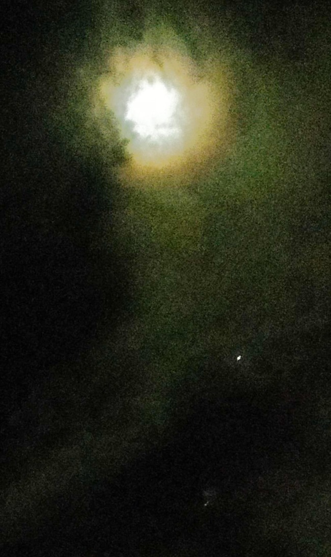 明け方3時にトイレに起きて空を見ると月がぼんやり。雲のせいなのか眠気の目のせいなのか。
